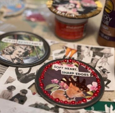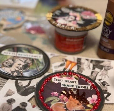 We'll gather around linen-covered tables in the Blue Ridge foothills, work with suffragette imagery, vintage photographs of working women, protest ephemera, bold trims, and orange pom poms, and build assemblage pieces that carry the energy of every woman who came before us — and every woman at the table.